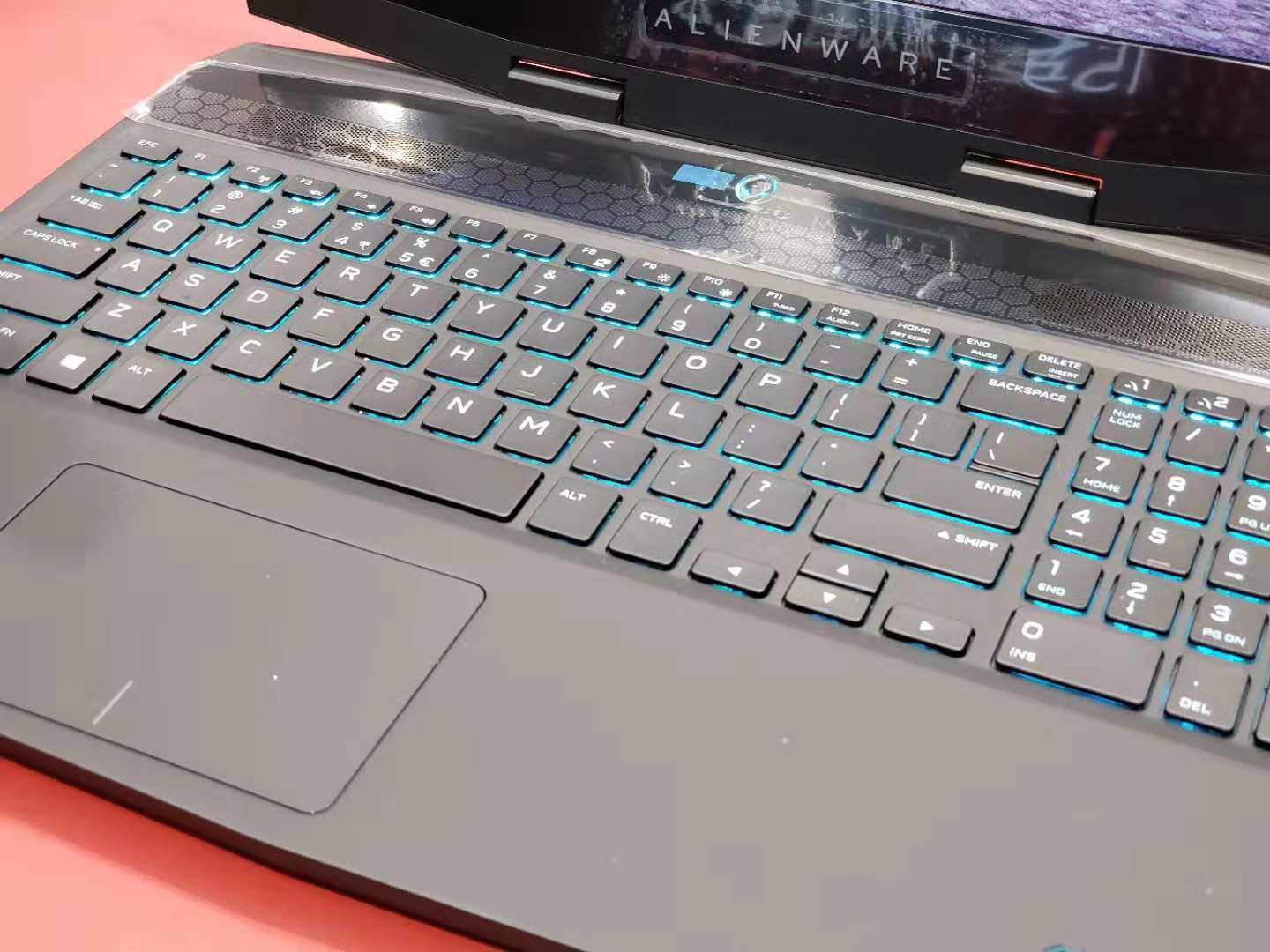 外星人喜闻乐见的键盘灯效方面采用了四区域控制的设计,也就是说并不支持单个按键的背光颜色控制。右侧保留了小键盘,所以整个键盘连带着触控板是偏左的,如果习惯了不带小键盘的话估计要适应一阵子。不过遗憾的是这个键盘并不防泼溅,也不支持指纹识别。不过触控板采用了玻璃材质,手感上相当顺滑。