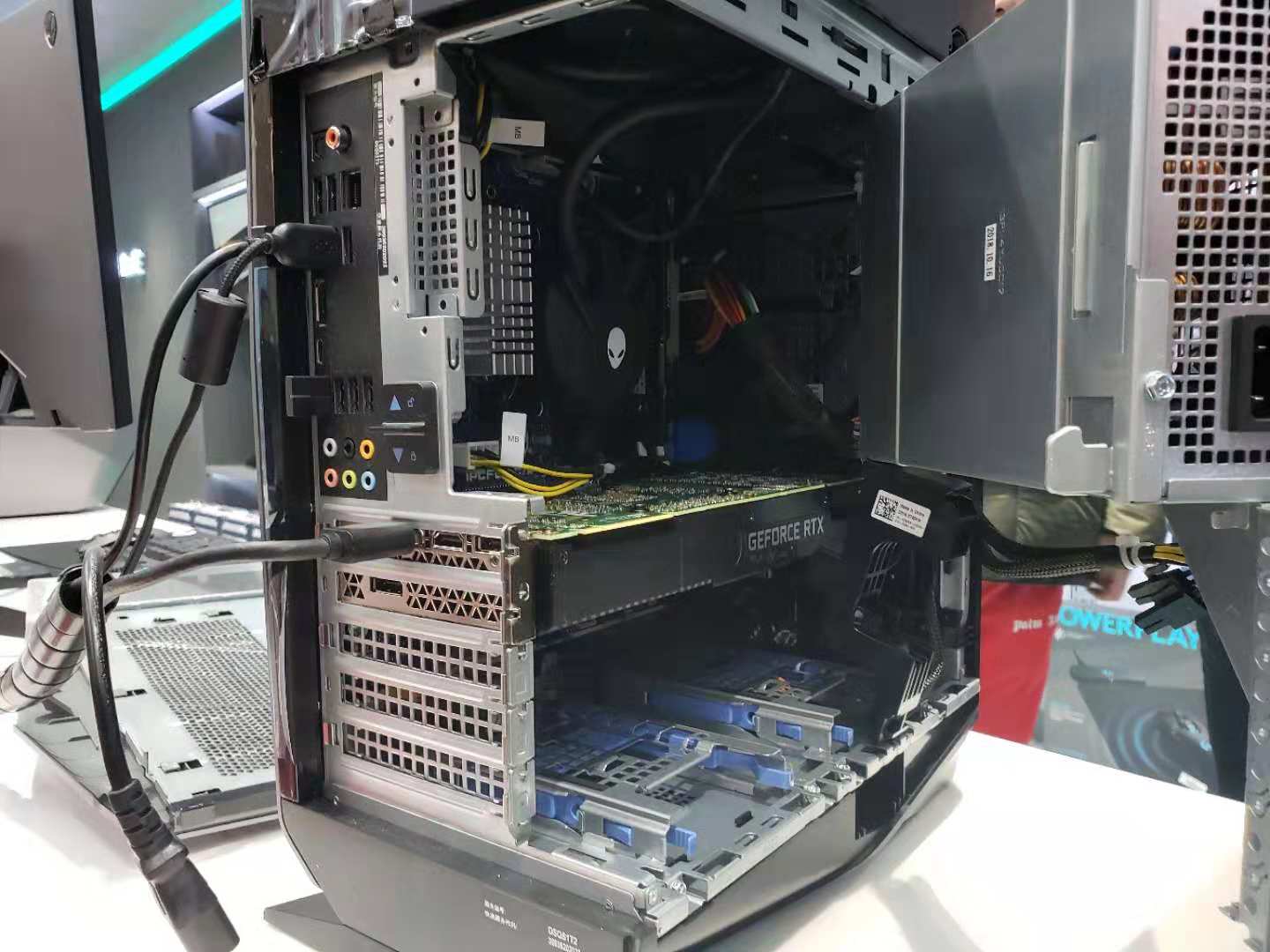 至于接口部分,这种台式机其实都是比较齐全的,想了解具体详情可以查看官网,这里就不再赘述了。另外 ALIENWARE AURORA 的特色是电源采用了侧拉式打开的设计,将电源拉出后可以看到里面的水冷设计和主板。电源规格方面则是标配 850W,能够满足一般旗舰显卡或是不太极端的双路显卡。