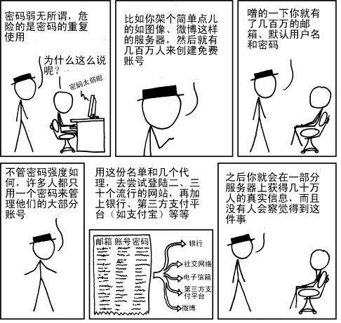 而要说的是,许多人都意识到了这点,并且为了避免这种情况,相当一部分人选择将密码分为两部分,一个主要部分(比如是 123456 ),另一部分则根据账户而定: 比如 QQ 的密码就设为 qq123456 ,而 hotmail 的密码则是 hotmail123456 等等。