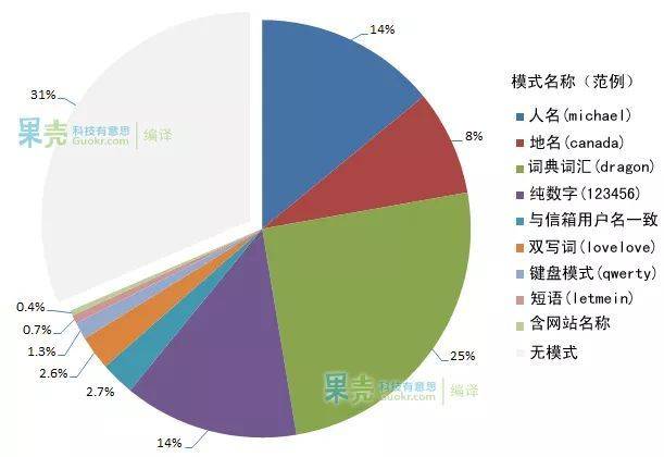 有人对用户的密码做过统计,研究他们设置密码时的偏好,并将统计结果绘制成图: 61% 的用户喜欢使用人名、地名、字典词汇和纯数字来设置他们的密码,甚至还有 2.6% 的用户直接把他们的用户名当做密码使用(比如把 guokr123@… 的密码直接设置为 guokr123 )。