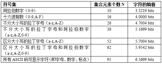 这里引入信息学中的信息熵(我们常听人说这个信息多、那个信息少,对信息 「多少」 的量化就是信息熵),用它来作为密码强度的评估标准。信息熵计算公式为 H = L log 2 N,其中,L 表示密码的长度,N 的取值见下表: