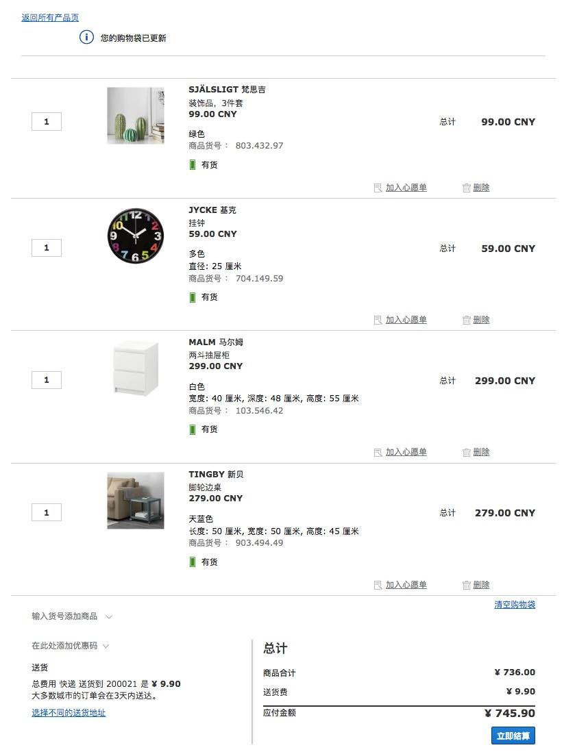 当我在原本购物单上加上一张床后,邮费就从原来的 9.9 变成 69 元,而不是「9.9+69」,应该就是介绍中说的「整体送货」计价方式了。