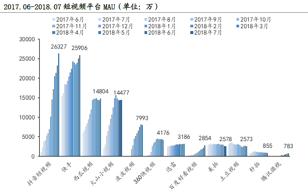 2018 年 6 月,快手月活用户达到 2.66 亿,居短视频首位;7 月,抖音宣布全球月活跃用户数超过 5 亿。此消彼长,秒拍从 2017 年下半年开始在短视频战争中失势,根据艾瑞咨询的数据,目前的秒拍和第一梯队的短视频平台已经不在一个数量级。