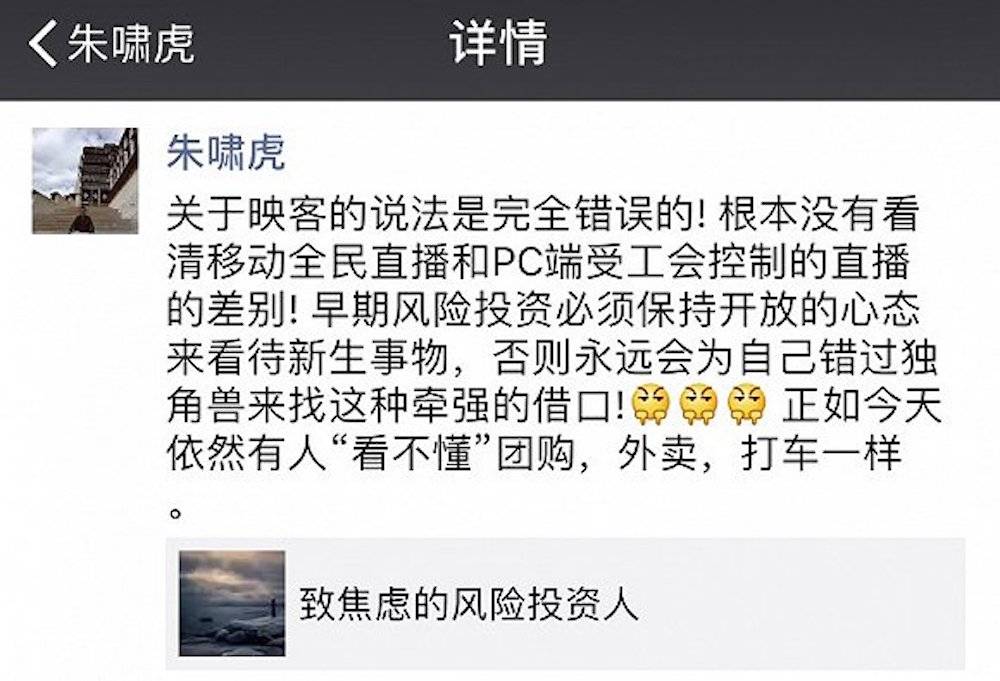 2017 年有投资人拿映客流量下滑出来说事,表达自己当年不投映客的先见之明。朱啸虎立刻回怼,认为全民直播和 PC 端受公会控制的秀场直播有本质区别。