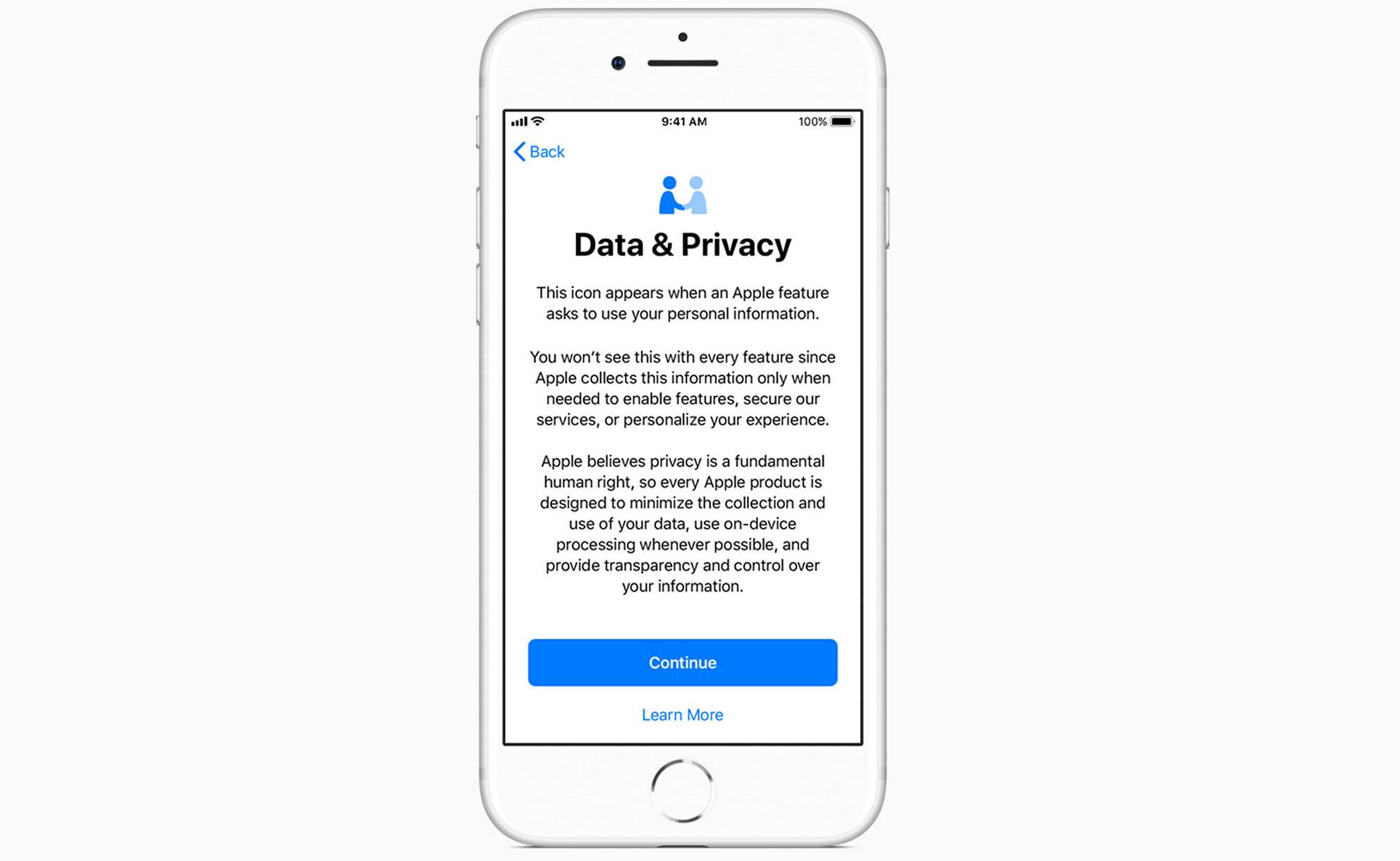 第三点是强调把数据收集透明化,任何涉及收集用户信息的操作,都会明确说明类型和原因。苹果为此发布了一个新的符号,但凡出现这个符号就代表操作涉及隐私操作。