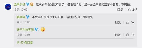 @ 坚果手机 表示,「这次发布会我就不去了」。锤子旗下空气净化器 @ 畅呼吸 回复道:「不发手机你也过来玩玩呗,请你吃火锅。微辣的。」