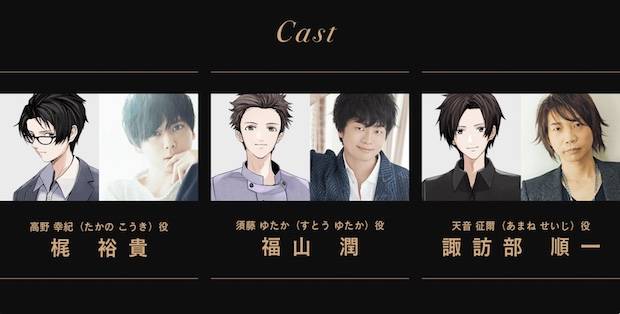 它由三个知名声优为动漫角色配音而来,三位男主角都具备人物性格和故事,目前已出的角色是由 Jun Fukuyama 配音的 Yutaka Sudo,空间设计师,喜欢拍照,经常去一家私营的咖啡馆。另两位是由 Yuki Kaji 配音的 Koki Takano 和由 Junichi Suwabe 配音的 Seiji Amane。