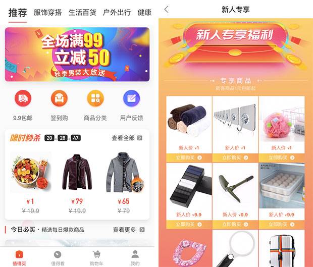 首页的设计较为简洁,无论是「秋季男装满 99-50」的横幅广告,还是「9.9 包邮」、「限时秒杀」等栏目,都难免让人想起同样走低价路线的拼多多。