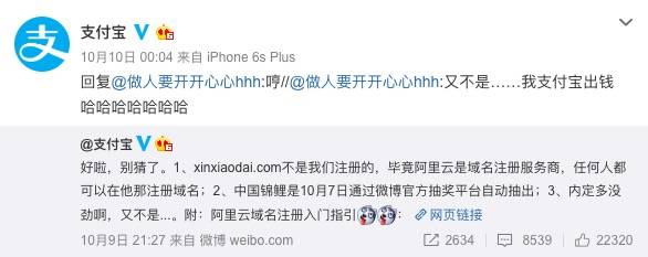 随后支付宝回应,阿里云是注册域名服务商,谁都可以在上面注册。澄清了锦鲤内定质疑,又为自家阿里云打了个广告。