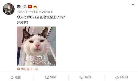 对于网友们「直播辞职」的愿望,她表示不愿意给老板造成麻烦,起码会把第四季度的工作做好再考虑辞职。