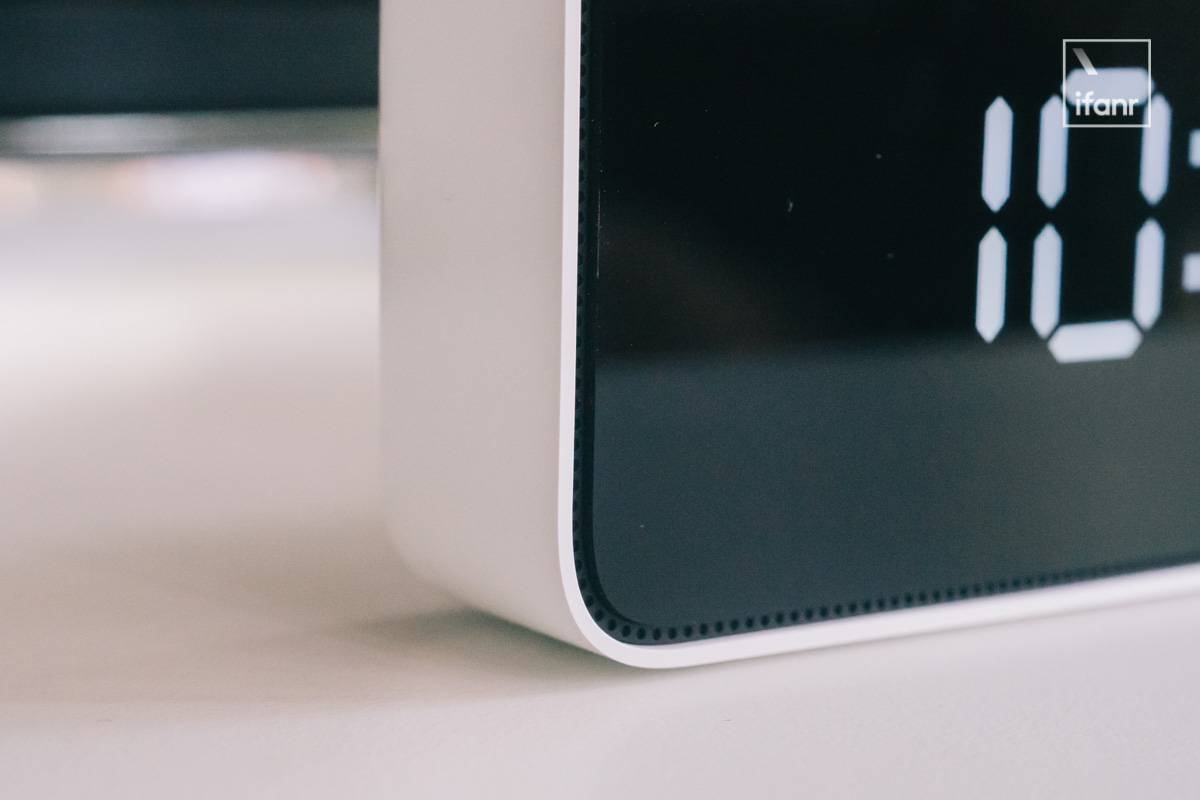 仔细观察的话,还能看到围绕了前面板一整圈的开孔,里面是小米智能闹钟采用的线性四麦设计,即便距离较远、或正在播放声音,也能听清楚用户的呼唤。