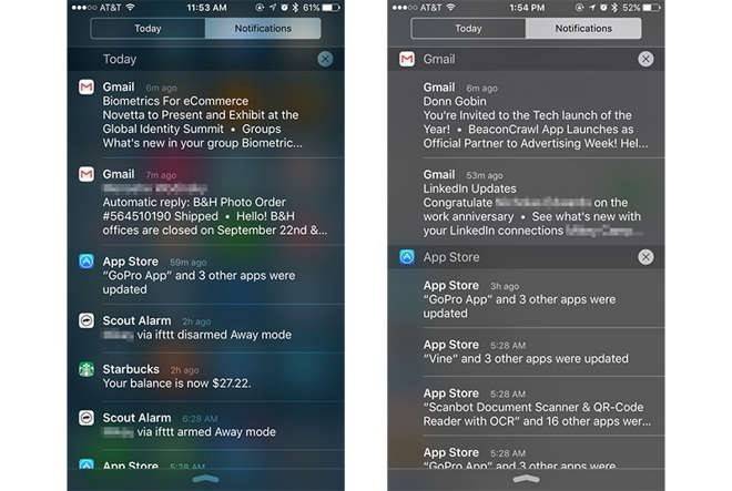 就像我之前提到的,iOS9 允许你按 App 将通知分组,新系统也将使用这个可选功能。一个简单的切换,可以轻松打开或关闭分组功能。考虑到不是每个人都喜欢这个功能,所以具有选择灵活性是非常值得肯定的。