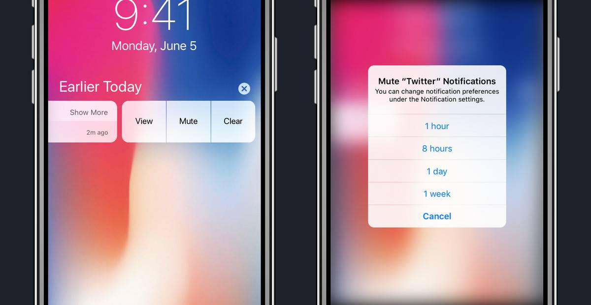 「按 App 分组」系统的另一功能是,你能够选择关闭通知(mute notifications),或暂时休眠通知。