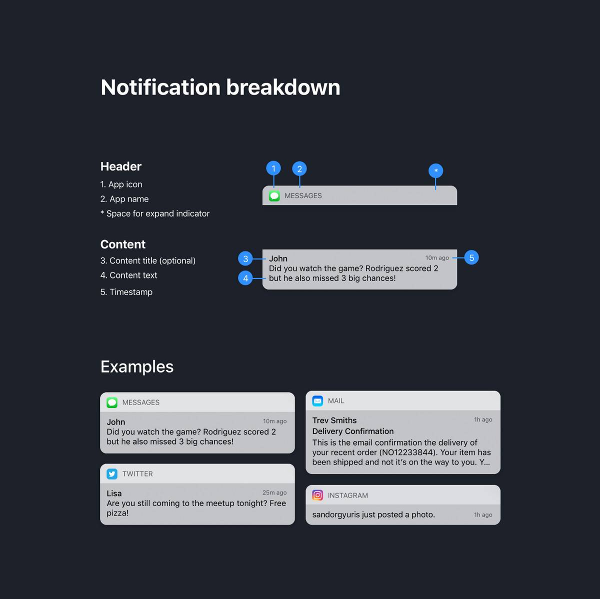 基于上面提到的局限性,我创建了一个新的系统,且自认为它能很好地处理这些场景。与 iOS11 相比,新系统对单个通知并没有大的改动。我从 iOS10 中带回了标头 (Header),所以它看起来有点像当前系统的窗体小部件。新系统将时间戳移动到内容区域以指示何时发出特定通知,并为展开指示器创建空间(稍后我将在多个通知部分对此进行解释)。这些变化虽然比较细微,但却非常重要。