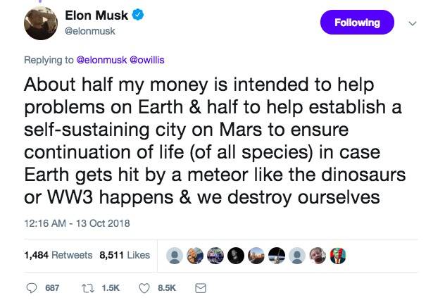 我一半的财产会用来解决地球上的问题;而另一半则用于在火星上建一个自给自足的城市,让地球在被陨石撞击 / 第三次世界大战 / 我们自作自受毁灭之时,生命还得以延续。