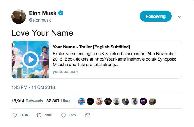 马斯克最近在 Twitter 自曝二次元属性,在点赞新海诚电影《你的名字。》后,他回复网友评论表示很喜欢宫崎骏的作品《千与千寻》和《幽灵公主》,有看过《新世纪福音战士》,甚至自称「埃隆酱」……