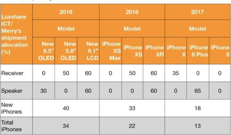 而报告中的一张图表似乎表明,2019 款 iPhone 仍然会推出 5.8 英寸(OLED)、6.1 英寸(LCD)和 6.5 英寸(OLED)这三种型号。