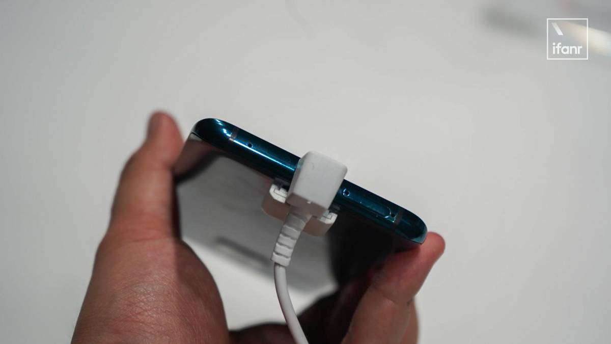 机身底部可以看到 Type-C 数据接口以及卡槽开孔,但我们熟悉的扬声器开孔则聪明地与数据接口整合到一起,发声处位于 Type-C 接口之内,配合顶部的听筒位置,组成了立体声双扬声器的配置,视觉上也更趋向于一体化。
