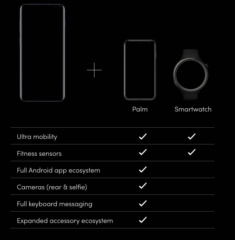 作为印证,你在 Palm 的新官网上会看到一张对比图,它将自己和智能手表这类可穿戴设备做对比,强调 Palm 能够比智能手表拥有更高的独立性,比如运行完整版版的 Android 应用、拍照以及用全键盘打字等。