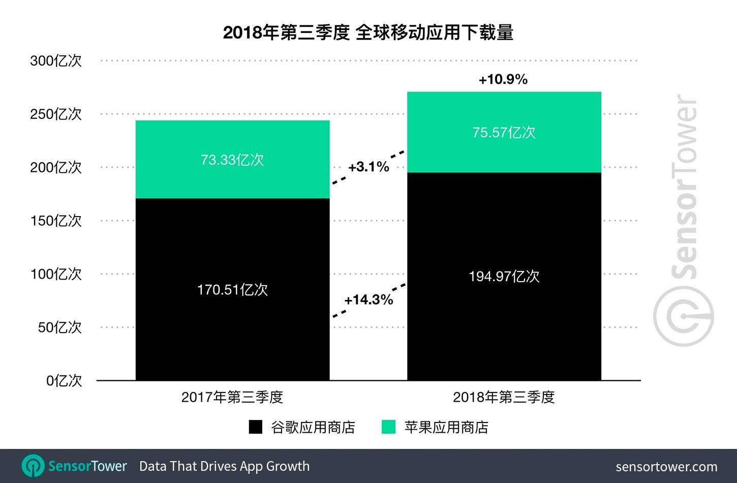 ▲谷歌和苹果应用商店下载量比较. 图片来自:Sensor Tower