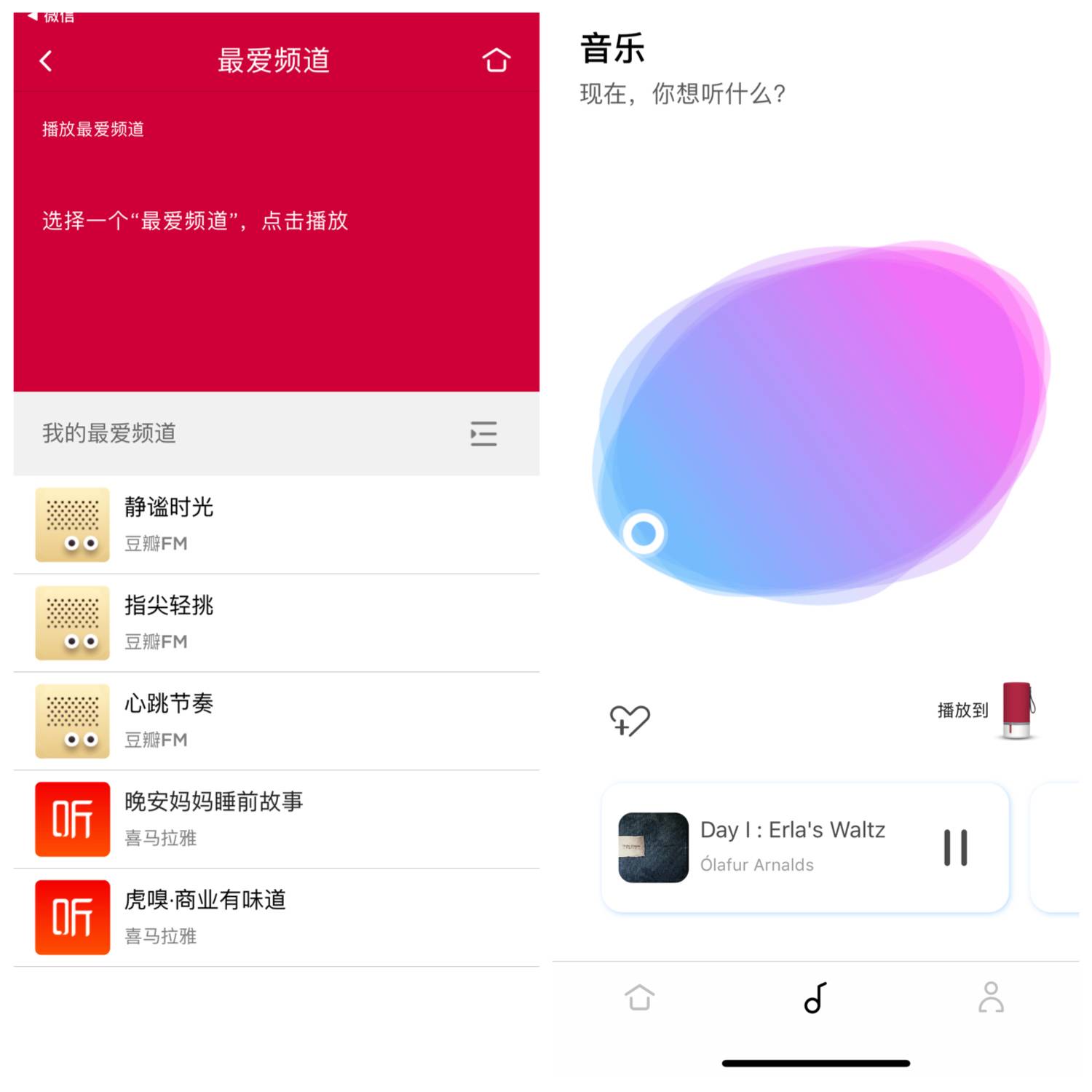 ZIPP 2 虽说可以保存 5 个最爱频道,但在使用过程中我只看到了豆瓣电台和喜马拉雅,所以感觉不是很能满足大众胃口,不过要是你有 QQ 音乐会员就另说了,授权之后可以关联 QQ 音乐的个人曲库。此外随机播放音乐的功能很不错,通过颜色来区分音乐氛围,移动到蓝色块越多的地方时音乐就越舒缓,而红色部分越多的地方则越热烈,不用考虑选择什么歌单,只需要想清楚自己想要的氛围,动动手指立刻播放。