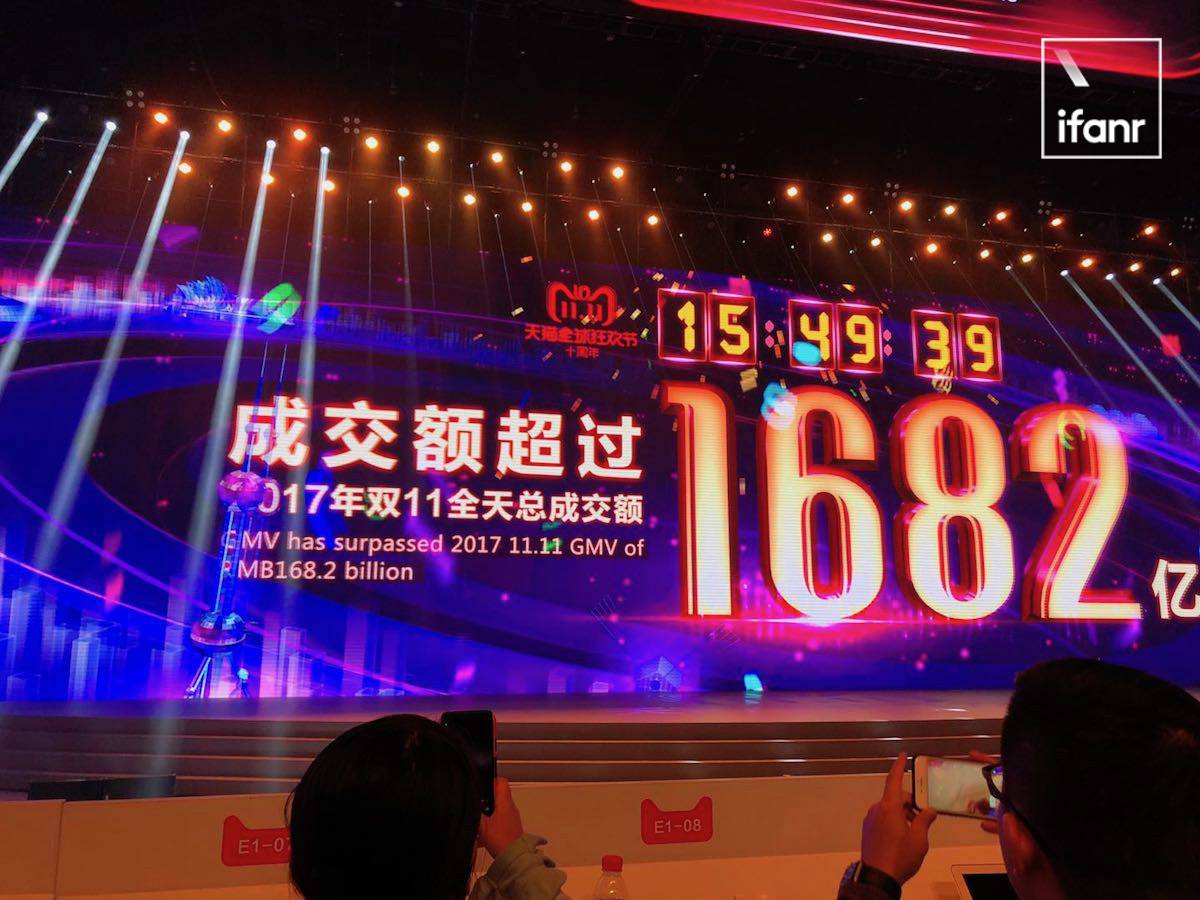 今年天猫双 11 不仅在凌晨刷新突破 500 亿、1000 亿交易额的速度,而且,截至 11 月 11 日,下午 15 点 49 分 39 秒,双 11 的交易金额正式突破去年的全天交易额 1682 亿元!