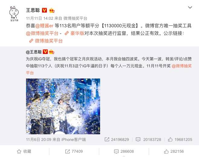 为了庆祝 iG 夺冠,王思聪在 11 月初搞起抽奖活动,表示本月会抽四波奖,第一波抽取 113 个人,每人奖金 1 万元现金。
