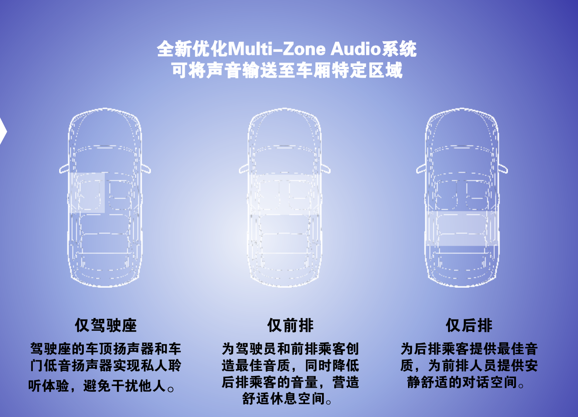 车主还可以锁定区域,让声音在车厢的特定区域播放,共分为前中后,这样前排驾驶员听歌的时候就不会对后排休息的乘客造成干扰。