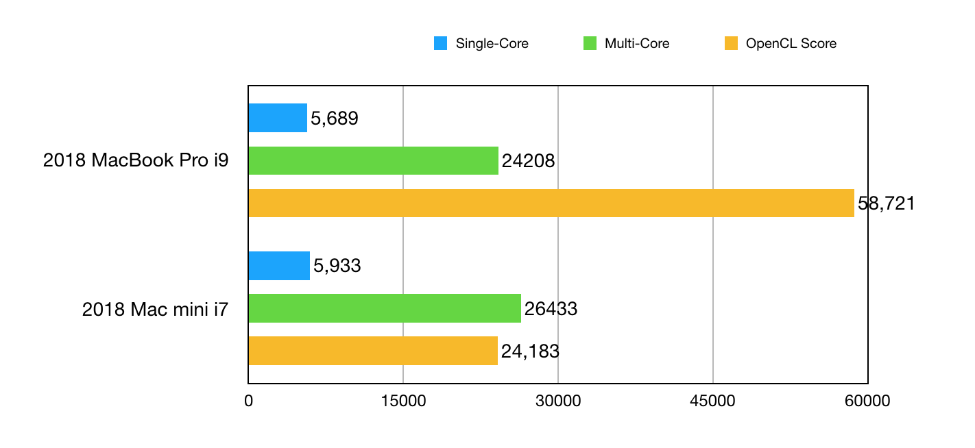 如果和 iMac 相比的话,如果和最顶配的 i7 7700k 相比,那在单核性能上还是略输一筹,但 Mac mini 在多核表现上扳回一局。毕竟 iMac 最多也就四核心,而 Mac mini 的 i7 是六核心。总之,你不用担心这次的 Mac mini 还想以前一样是个入门级玩具,唯一需要担心的是——显卡。
