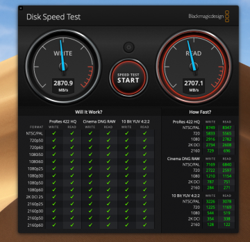 至于这块 SSD 存储的性能,使用 Blackmagic Speed Test 软件得出的数据是读写都能够达到 2700 MB/s 以上,非常强悍。 荣获爱范儿「地表最强」评价的 4T 版 MacBook Pro 写入性能也不过 2200 MB/s。