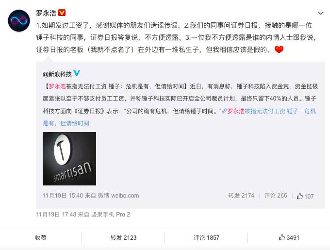 罗永浩否认锤子没钱付工资:「感谢」媒体造谣传谣