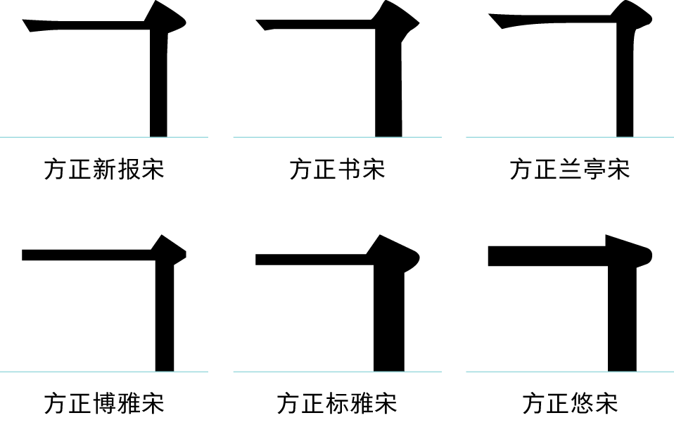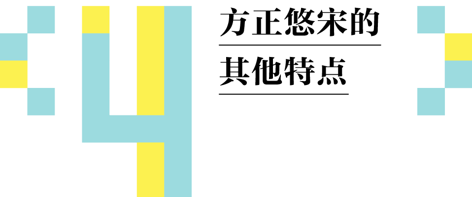 宋体与黑体最大的区别,是笔画端点处的装饰角与笔画粗细的对比,方正悠宋将传统的倒三角样式改为直角三角形样式,使得字形与像素更为契合,提高字形在屏幕上显示的清晰度。在这样的设计理念下,方正悠宋的设计拥有了黑体的特性,也更加适合矩阵式的像素排列。