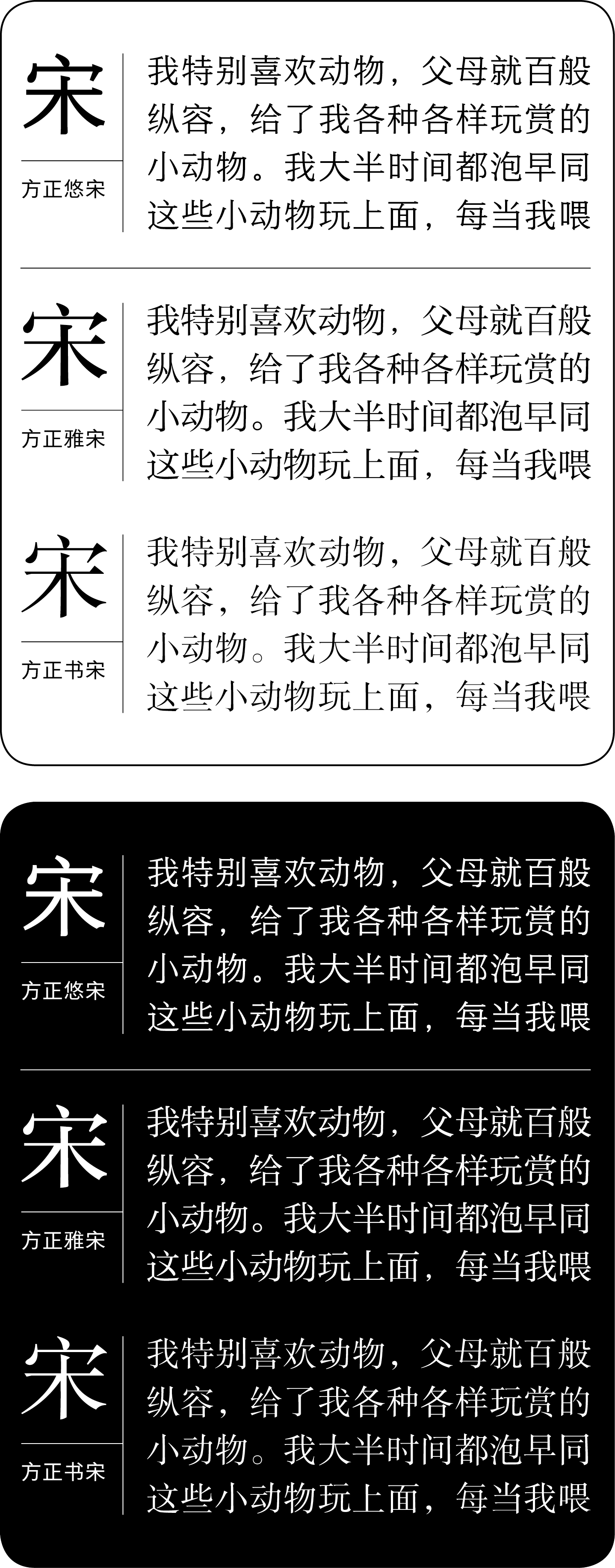 在屏幕显示中,无论是白色还是黑色背景下,方正悠宋的阅读效果都更为舒适。而方正雅宋与方正书宋偶尔都有过挤或过松的问题,虽然它们也可显示于屏幕上,但「可用」和「适用」还是有所区别。