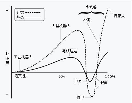 「恐怖谷」理论由日本人森政弘提出,当机器人的拟人程度增加,人类对它的好感呈现「增加 – 骤减 – 骤增」的曲线,「骤减 – 骤增」这个范围就是恐怖谷。