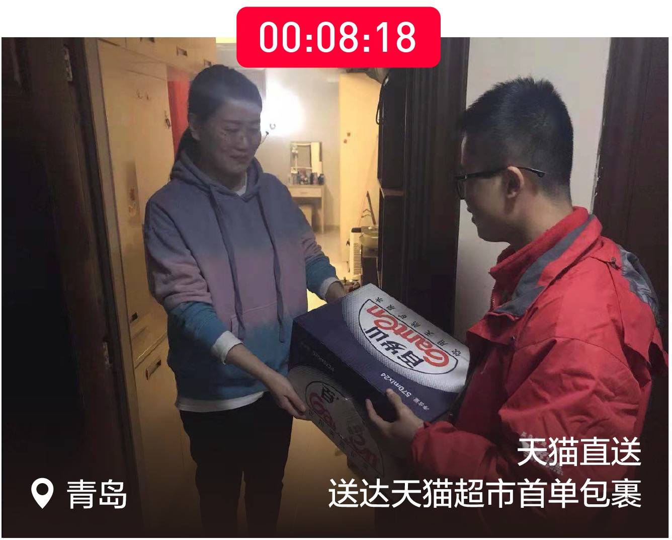 双 11 正式开始才 8 分钟,青岛的一位消费者就收到了来自天猫超市的一箱矿泉水。去年收单的刘先生,在 12 分 18 秒时才签收成功。