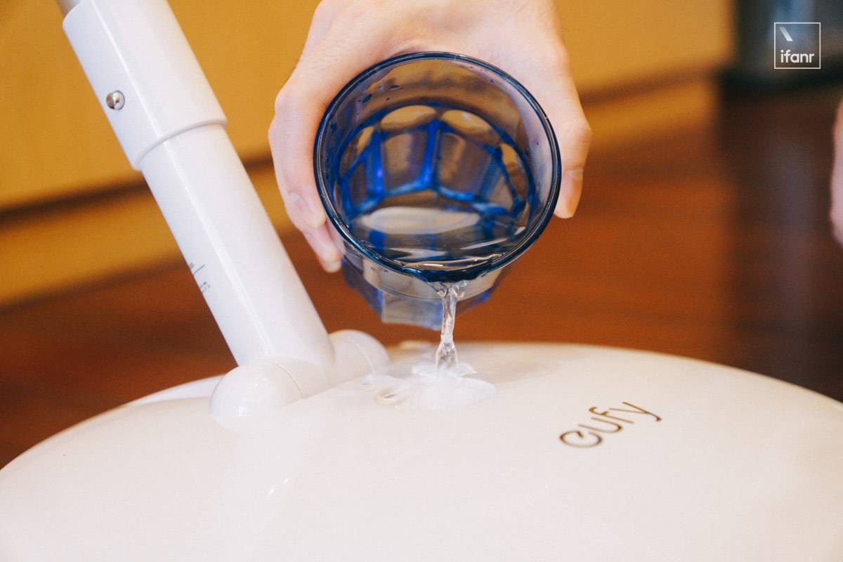 eufy 小旋风自带一个容量为 400ml 的水箱,并配备一键出水功能。用户在每次拖地前,在水箱中装满水,有需要时再按下位于拖杆上的出水键,拖头便会喷水。这样的设计不仅省时省力,还能避免造成水资源的浪费。