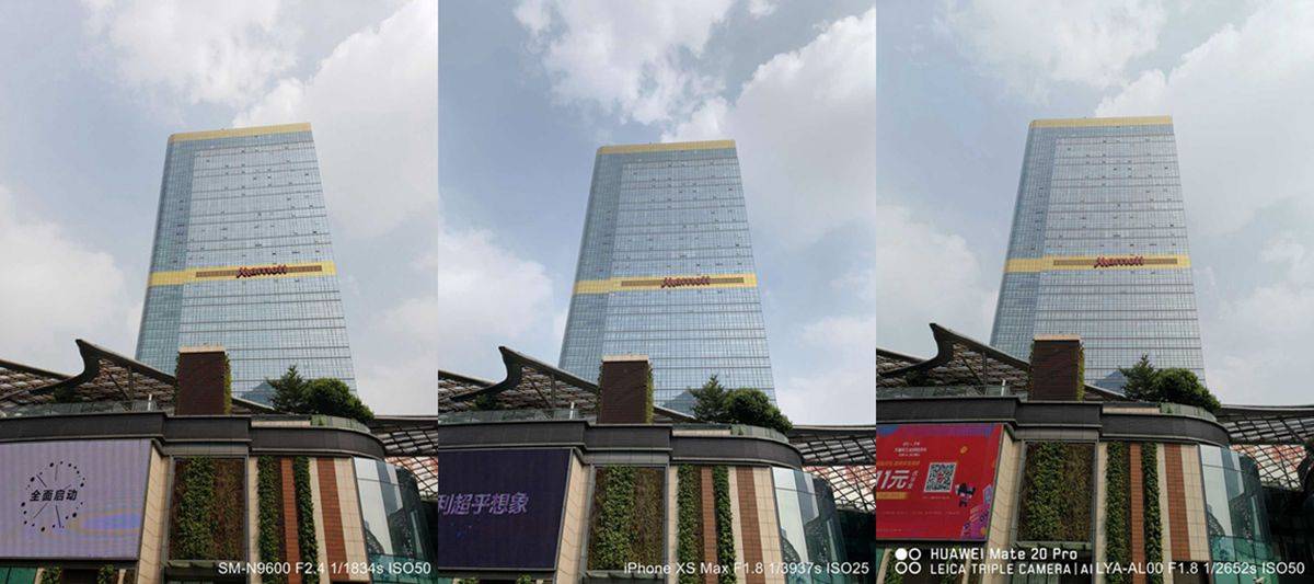 相比起 iPhone 和 Mate 20 Pro,Galaxy Note9 能够保留更多天空的细节,太阳这个强光源的眩光控制也做得很到位。在这个场景中可能会有后期再提高亮度的需要,但在保留细节画面细节方面,Galaxy Note9 要比另外两位做得在突出一点。