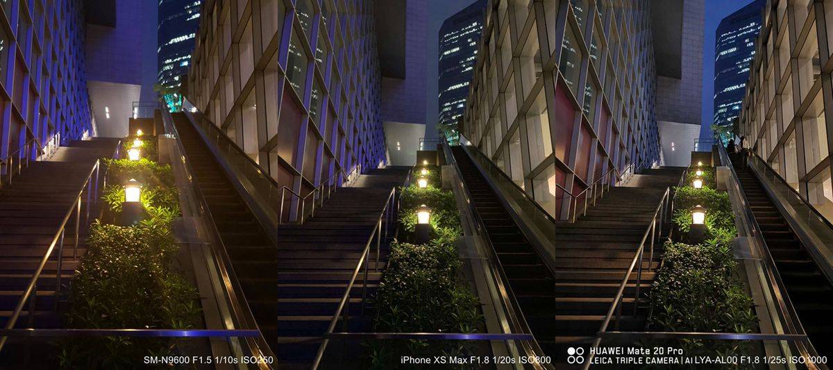 面对更加暗的场景,三款机器的表现其实也都不错,Mate 20 Pro 在控光方面的优势也依然能够保持。iPhone 在这里的表现则会更均衡一点,观感也比上一组要好。