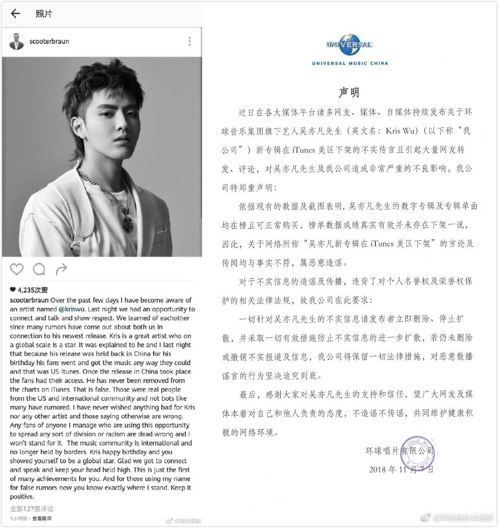 对于网络上「吴亦凡新专辑在 iTunes 美区下架」一说,环球音乐表示为恶意造谣,用户仍能在美区 iTunes 购买。