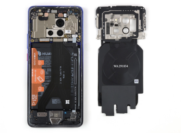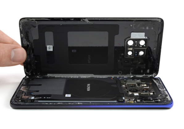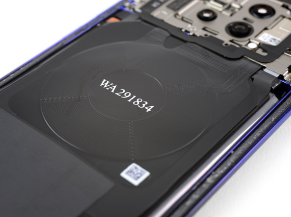 移除背盖后,首先看到的就是 Mate 20 Pro 的双向无线充电线圈。华为之前一直没有在自家的产品中加入无线充电功能。而在 Mate 20 Pro 上,华为不仅直接来了个 15W 功率的无线充,实现了「无线比有些有线更快」,还加入了反向无线充功能。