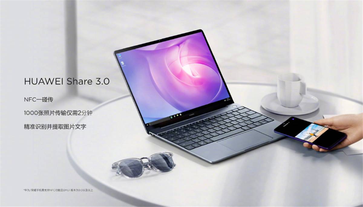 另外,对于华为消费者业务而言,他们最强的地方还是手机。因此,依托于巨大的手机出货量,以及背后的商务人群,华为在 MateBook 13 上开发出了一个名为 HUAWEI share 3.0 的技术,就是利用 NFC 功能让图片等文件在手机和电脑之间一碰即传,感觉上是要比苹果产品的 AirDrop 更快捷,不过应用场景要窄一些。