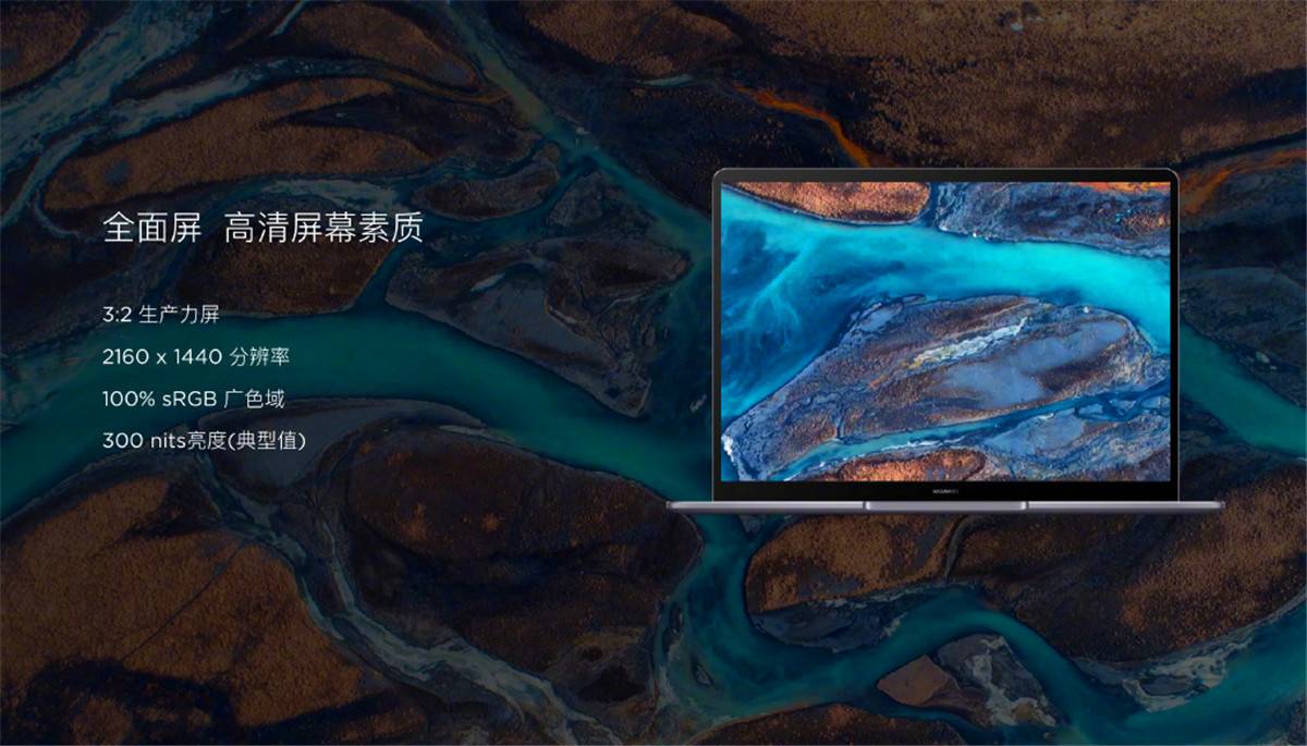 MateBook 13 外观上和去年推出的 MateBook X 一脉相承,都是金属材质外壳、3:2 比例的超窄边框屏幕。不同之处是,在 A 面,MateBook 13 不仅有 HUAWEI 的字母 Logo,这次连花瓣状的图案 Logo 也被印了上去。屏幕参数则是屏占比 88%,2160*1440 分辨率,sRGB 色域 100%。