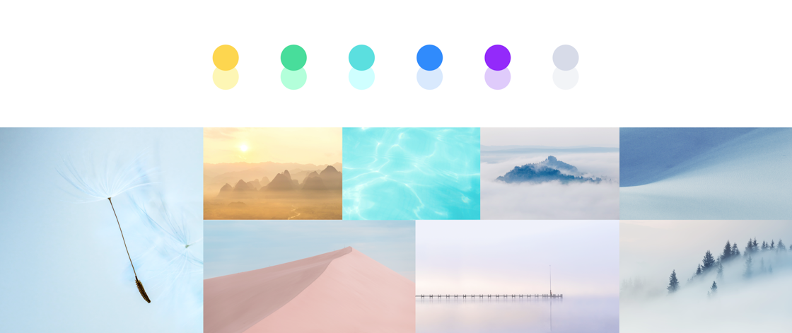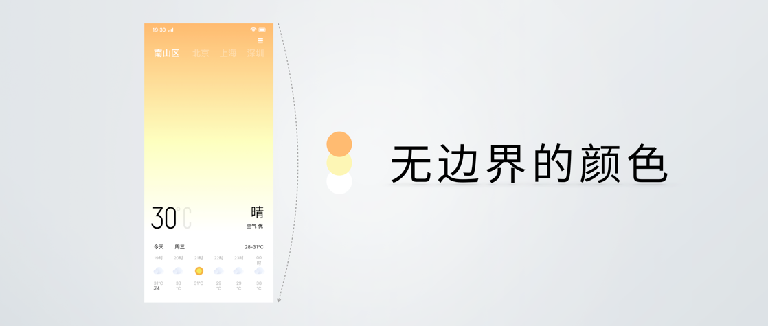 陈希的想法是,用户界面中首先使用偏淡雅的颜色,降低视觉刺激的阈值,舒缓视觉体验,再用淡雅颜色到白色的渐变过渡,形成渐进色。